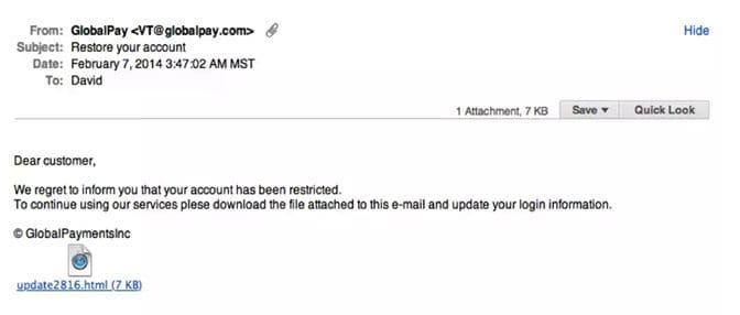 This type of spam email can send unsuspecting customers into a panic. But what account is exactly restricted? What is GlobalPay? The attachment could be anything from a web page to a document with a malicious code attached to a full on malware. Don’t fall for this spam email!